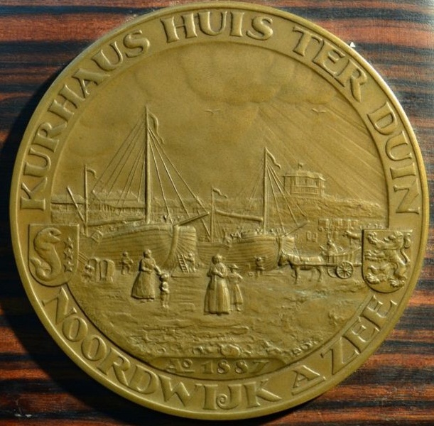 De munt werd uitgegeven bij gelegenheid van het 50-jarig bestaan van Huis ter Duin in 1937. Ik had er eerder een afbeelding van, maar deze is scherper. Als je erop klikt ontrolt zich een een complet beeld van het strand van Noordwijk met de eerste versie van Huis ter Duin in 3D en daar heb je geen apart brilletje voor nodig.