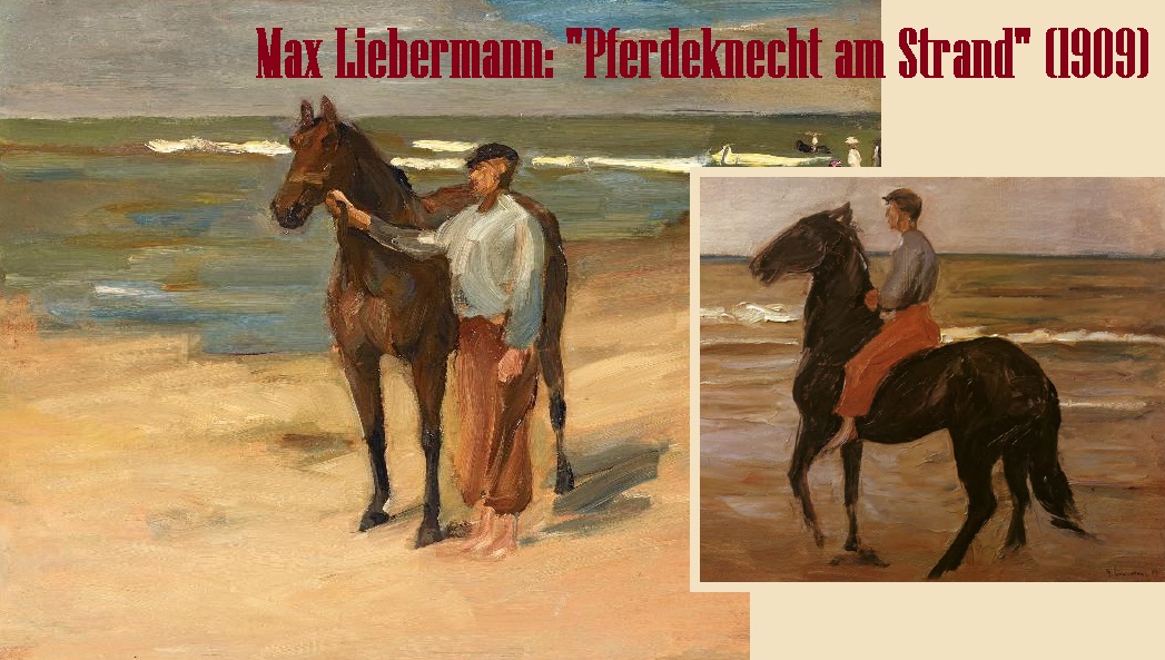 Beide schilderijen van Max Liebermann dateren van 1909 en zijn vermoedelijk gemaakt op het strand van Noordwijk. Volgens de kunstkenners zou het op de afbeeldingen gaan om één en dezelfde ‘Pferdeknecht’, maar of het ook om één en hetzelfde ‘Pferd’ gaat?