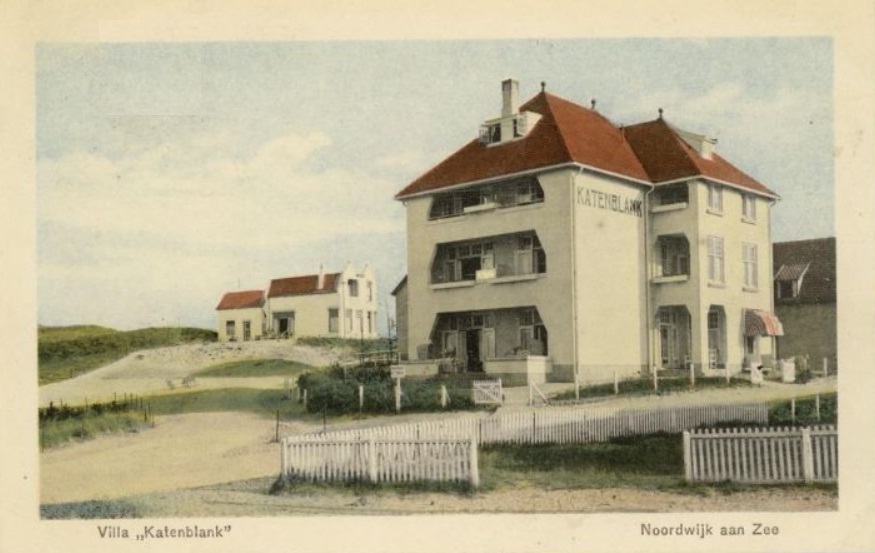 De Villa Katenblank. De naam “Katenblank” is waarschijnlijk een Noordwijkse verbastering van het Franse “Côte Blanc” (witte kust of witte heuvel). het schijnt dat hier ergens een stukkie onbegroeid duin lag (‘witte helling/heuvel’) en dat dit in de Franse tijd deze benaming kreeg, zij het dat Noordwijkers zich er de tong over braken en er dus maar iets Nortuks van maakten.