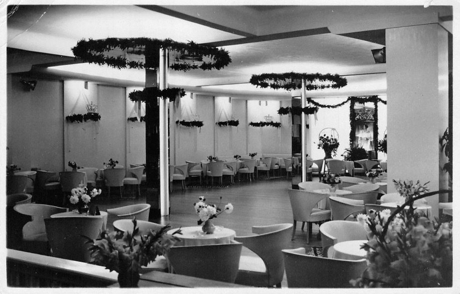 De Spiegelzaal van Huis ter Duin, ook wel ‘Salle de Danse’ genaamd, zo te zien in kerstsferen. Niet zo uitbundig als tegenwoordig (dat hele Huis ter Duin is van buiten zo ongeveer één grote kerstboom), maar toch. De zaal (in de stijl van wat ik ‘nieuwe tuttigheid’ noemde) was overigens ontworpen door de Nederlandse architect Bernard Bijvoet. Ik schreef er al eens eerder over.
