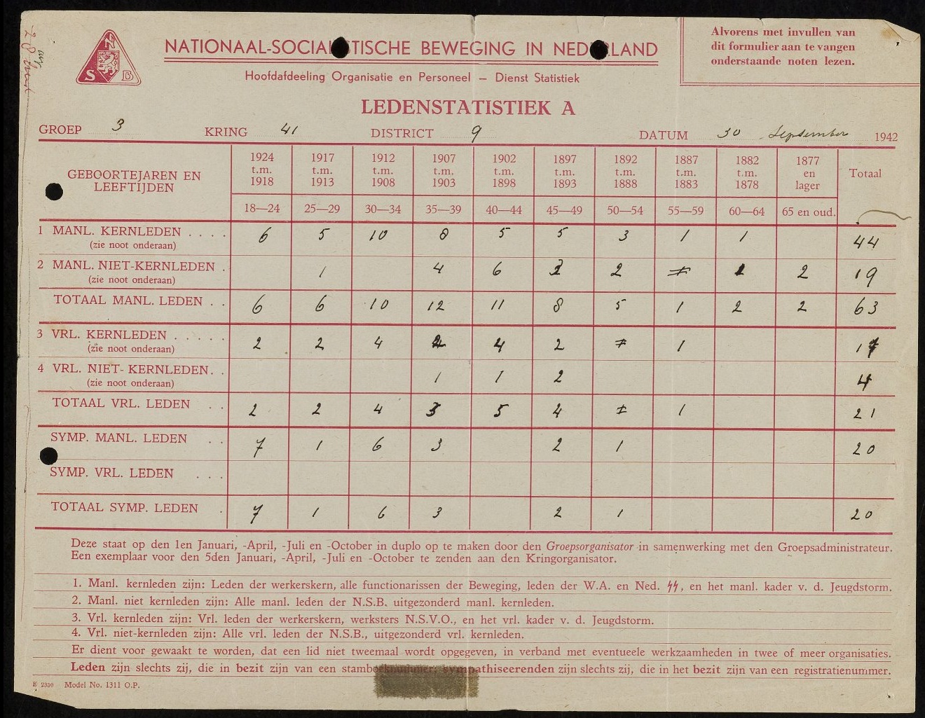 Statistiek van het aantal leden van de Nationaal-Socialistische Beweging (NSB) in Noordwijk, in NSB-jargon: Groep 3 van Kring 41 van District 9 (Datum 30 september 1942). Het valt me eigenlijk wel mee: in totaal 83 mannen en 21 vrouwen waren lid. Maar onder die leden was er wel een onderscheid: je had gewone leden, kernleden en sympathiserende leden. Het onderscheid tussen deze laatste categorie en de overige leden was dat de overige leden een ‘stamboeknummer’ hadden en de sympathiserenden slechts een ‘registratienummer’. Het verschil ertussen is mij niet geheel duidelijk (wanneer kreeg je het één en wanneer kreeg je het ander?), maar over het stamboeknummer weten wij meer, dankzij de Wikipedia: