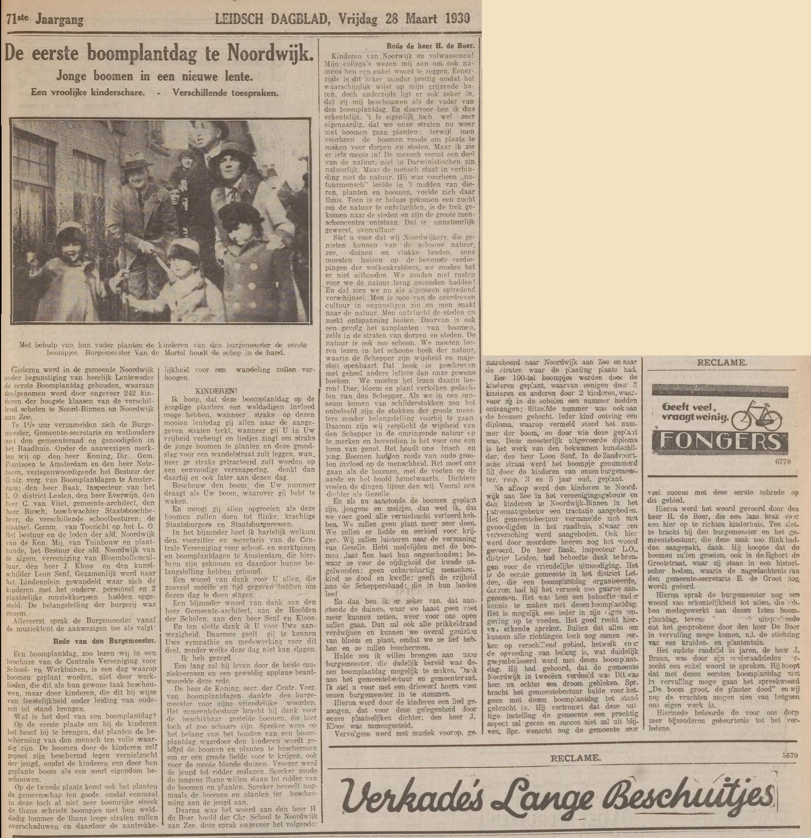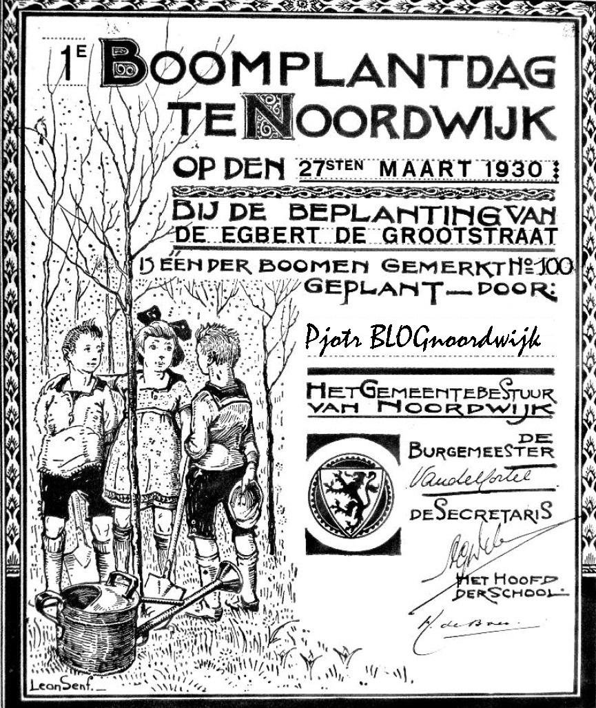 Op de achterkant van de nieuwe Blauwdotter dit getuigschrift. Het werd uitgereikt aan schoolkinderen in Noordwijk Binnen en Noordwijk aan Zee die meededen aan de 1e Boomplantdag op 27 maart 1930. De dag was bedoeld om de kinderen meer gevoel bij te brengen voor de natuur en en passant werd de gemeente een fiks aantal bomen rijker.