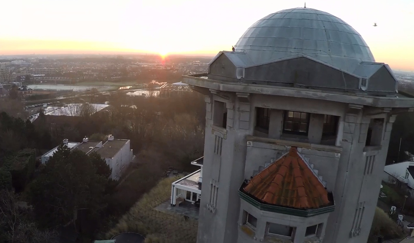 Een even ongewoon als schitterend beeld van de watertoren. Het is afkomstig uit een drone-filmpje van Koen Olijerhoek (Koenyvision). Dat filmpje is hier terug te vinden, maar alleen al dit ene beeld: onwerkelijk mooi.