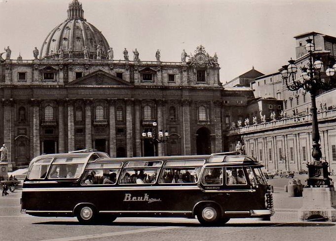 Ik denk niet dat er rooms-katholieke touringcars bestaan. Er zijn wel Pausmobielen, maar die zijn van een andere orde en vooral: van een andere grootte. Deze bus, een Scania Vabis van de firma Beuk uit Noordwijk deed evenwel een amechtige poging om alsnog zalig verklaard te worden door zich ostentatief op te stellen voor de St. Pieter in Rome. “Quo Vadis, Scania Vabis?” zong Neerlands Hoop 40 jaar geleden al en misschien was die vraag wel aan de firma Beuk gericht.