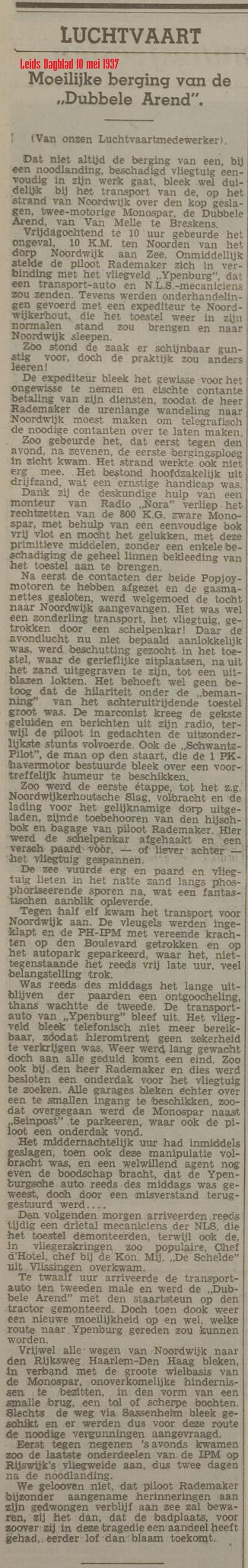 Op 8 mei 1937 vloog W. A. Rademakers met zijn chef Izaak van Melle van Breskens naar Amsterdam, maar ze worden bij Noordwijk gedwongen tot een noodlanding en slaan daarbij met vliegtuig en al over de kop. Van Melle was een bekende snoepfabrikant, die het blijkbaar wel interessant vond een vliegtuig te hebben als transportmiddel. In dit geval was dat een zgn. “Dubbele Arend” van General Aircraft Monospar. Ik schreef er allemaal al eerder over, maar nu kom ik een hilarisch verslag tegen uit het Leidsch Dagblad van 10 mei 1937, waarin gewag wordt gemaakt van de alleszins moeizame berging van het toestel. Paarden en schelpenkarren moesten er aan te pas komen. Een transporteur uit Noordwijkerhout wilde wel een handje helpen, maar eerst contant geld zien, waartoe Rademakers urenlang naar het dorp moest lopen om geld over te laten telegraferen. En toen het toestel eenmaal naast “Seinpost” geparkeerd stond, bleek de vrachtwagen, die het ding naar Ypenburg moest vervoeren al eerder onverrichterzake weer naar huis te zijn gestuurd. Enfin, lees het na in het Leidsch Dagblad. Het toestel zou overigens later uit de registers worden weggeschreven: het was onherstelbaar beschadigd.