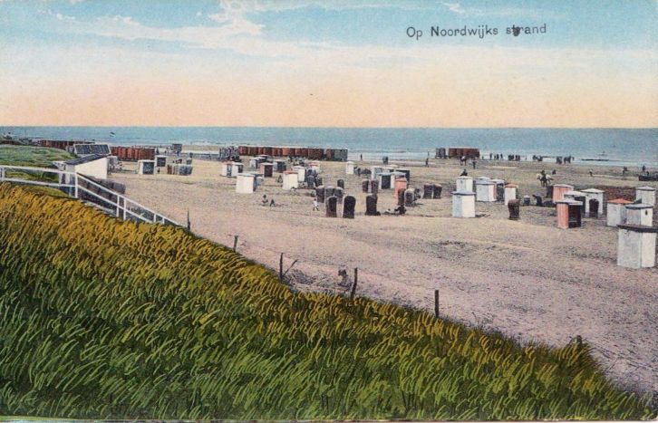 Ik weet niet zo goed op welk gedeelte van het strand we hier uitkijken. De trapleuning lijkt te duiden op Huis ter Duin, maar dan zou zo ongeveer het hele Noordwijksche badkoetsenpark zich hier in De Zuid bevinden? Ik geloof niet dat er veel badkoetsen in De Zuid hebben gestaan, ze stonden meestal (of uitsluitend) voor de Noordboulevard, waar zich ook de meeste toeristen ophielden. Dat zou betekenen dat de trapleuning een andere herkomst had en zich eerder bevond voor Hotel Noordzee. Ik denk dat dat meer voor de hand leit.