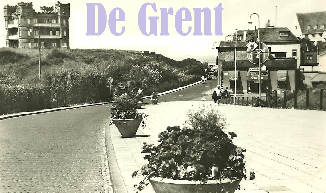 Een mooie foto van de Grent in Noordwijk aan Zee. De bloembakken op de voorgrond geven diepte, de weg slingert zich vanuit deze positie bijna om de stoep heen. Huis ter Zee links op het duin bewaart het evenwicht tegenover de bebouwing rechts. Mooi dat er weinig mensen of auto’s zijn te zien. Die hadden alle harmonie en evenwicht uit het beeld weggehaald.