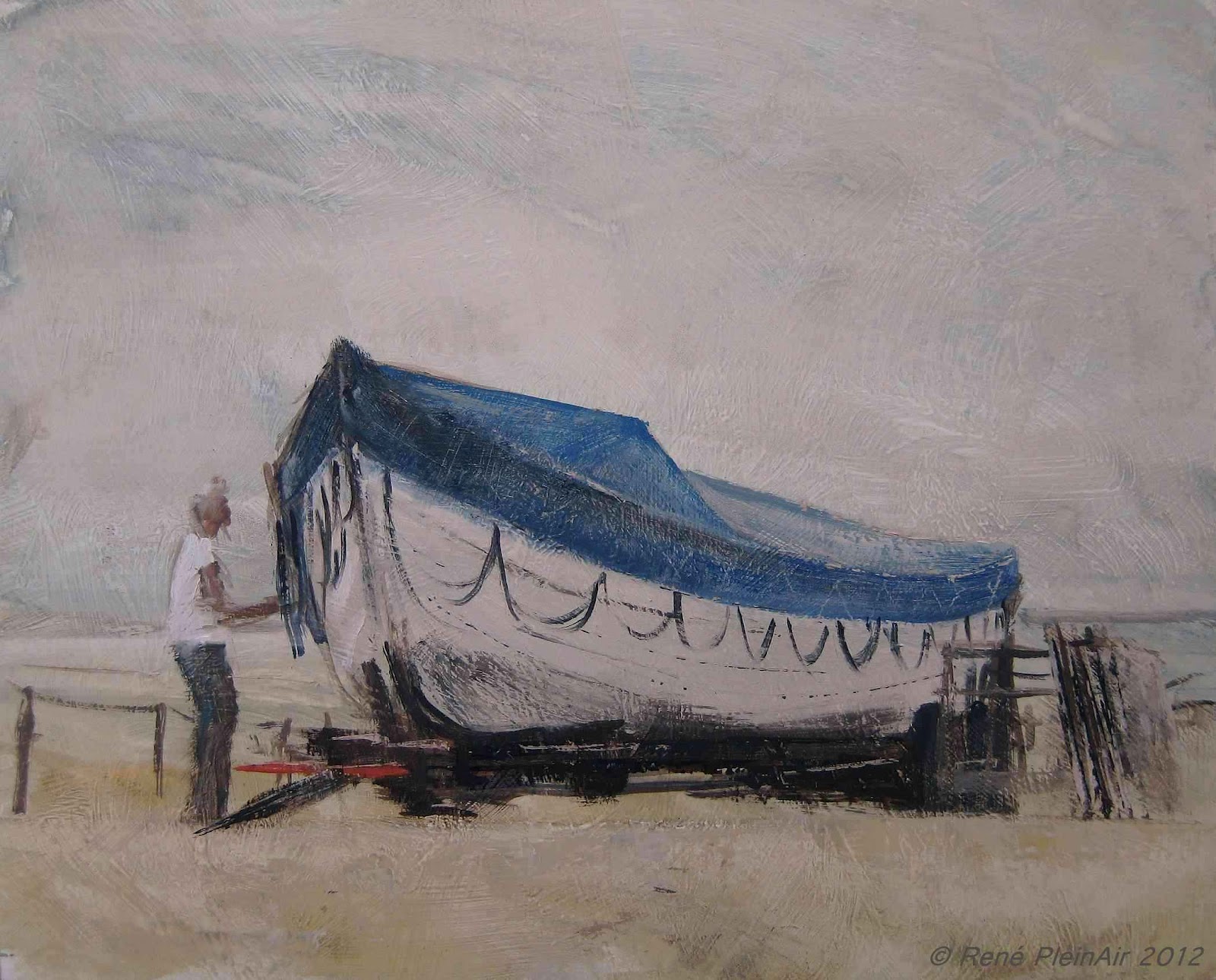 René Pleinair is een selfmade-kunstenaar die ik aan de hand van blogs en website ergens in Doetinchem kan traceren. Hij maakte verschillende – mooie – werken in Noordwijk, waaronder bovenstaande van een schipper, die zijn rondvaartboot inpakt. “Klaarmaken voor de storm” heet dit werk. Herkennen we in de man bij de boot good-old Jo van der Lippe?