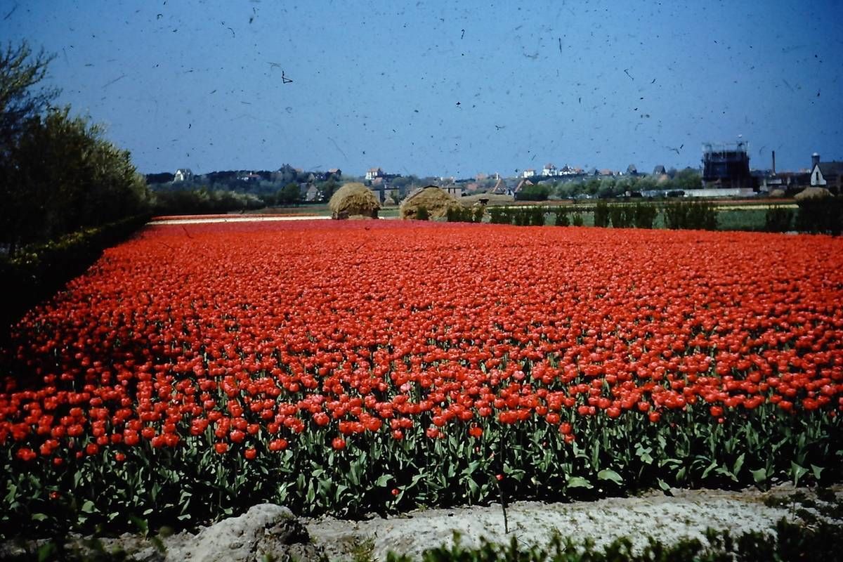 De foto is genomen van een dia. Daardoor verandert er volgens mij altijd iets aan de kleuren. Die lijken wel warmer te worden. In ieder geval is dit beeld van een tulpenakker in het Vinkenveld van een onbespoten pracht. Schitterende ‘hooischelften’ op de achtergrond.