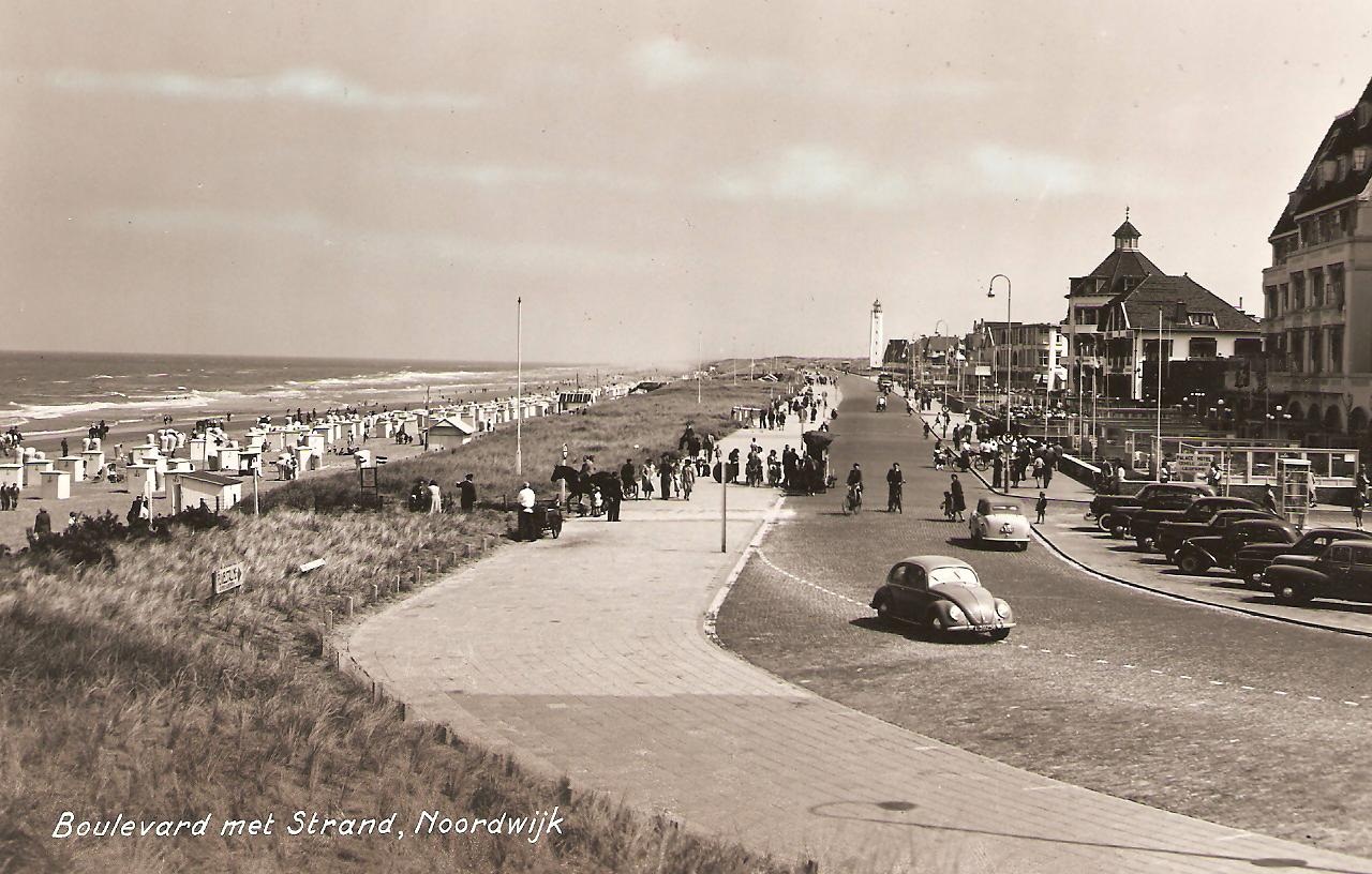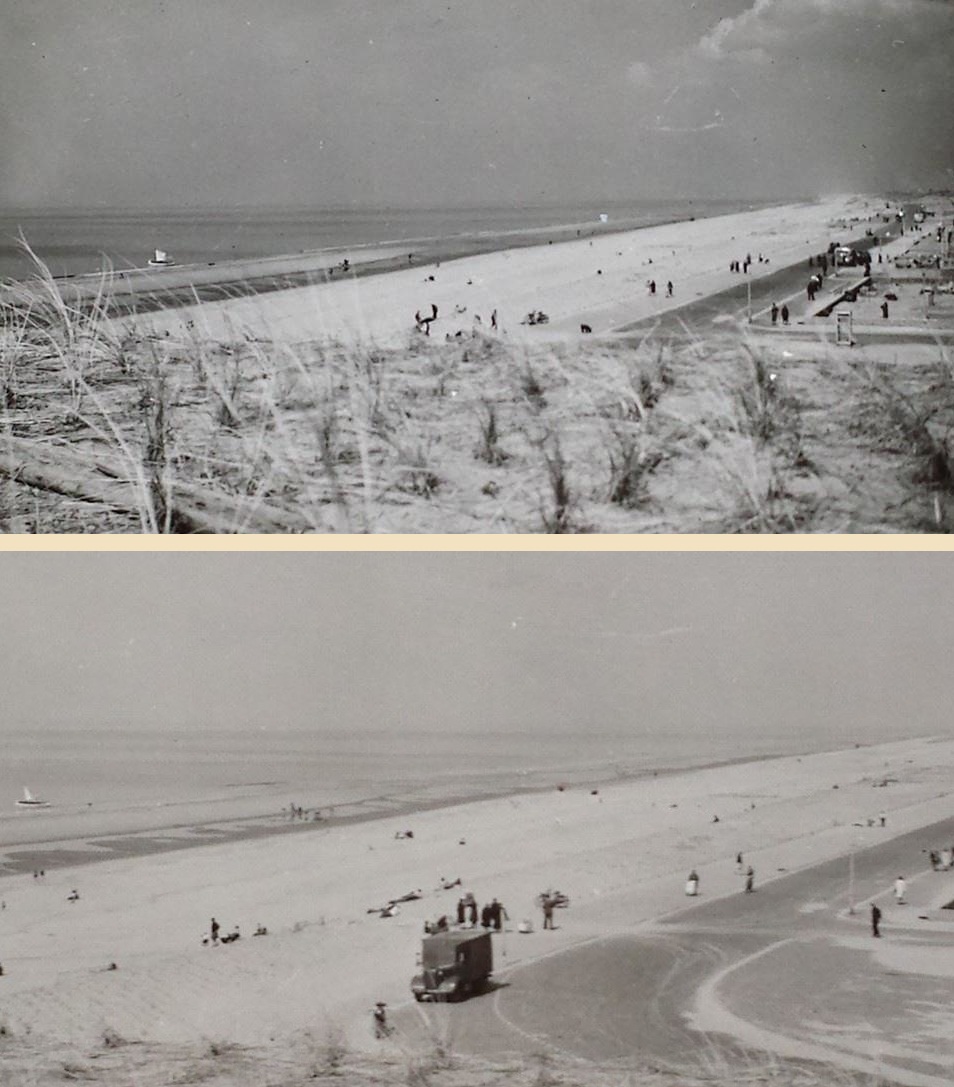 Op “Je bent een Noortukker” duiken deze twee prachtplaten op van medio 1947. De laatste restanten van het Oranje Hotel en Im Weissen Rössl (die in de oorlog ten onder waren gegaan) zijn toegedekt met een nieuwe bestrating. Evenals de Atlantikwall, die hier als een streep over de boulevard ging. De zeereep kan nog wel wat extra helm gebruiken, want het stuifzand is aardig opgerukt. Op de bovenste foto staat al een telefooncel. Daar lijkt op de plek van de “Rössl” nog een muurtje te staan. Of is dat al het terras van Palace?