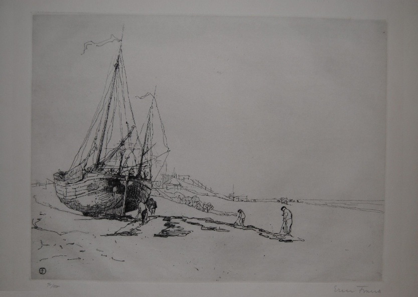 De titel van deze ets geldt op ebay.com als “Fischerboote in Norwyk”, maar we mogen gevoeglijk aannemen dat met ‘Norwyk’ ‘Noordwijk’ wordt bedoeld. De print dateert van 1922 en is van de hand van de Duitse kunstenares Erna Frank (1881-1931). In dat jaar – 1922 – zou Erna Frank dus Noordwijk moeten hebben bezocht. Maar dat hoeft niet zo te zijn. In 1922 was de bomschuit, zoals hier afgebeeld, allang verdwenen. Daar hadden de nieuwerwetse loggers, de houtworm en de boktor al wel voor gezorgd. Vermoedelijk had Frank een fotokaart van de bomschuit gekregen, heel misschien had ze die zelf wel in Noordwijk opgedoken.