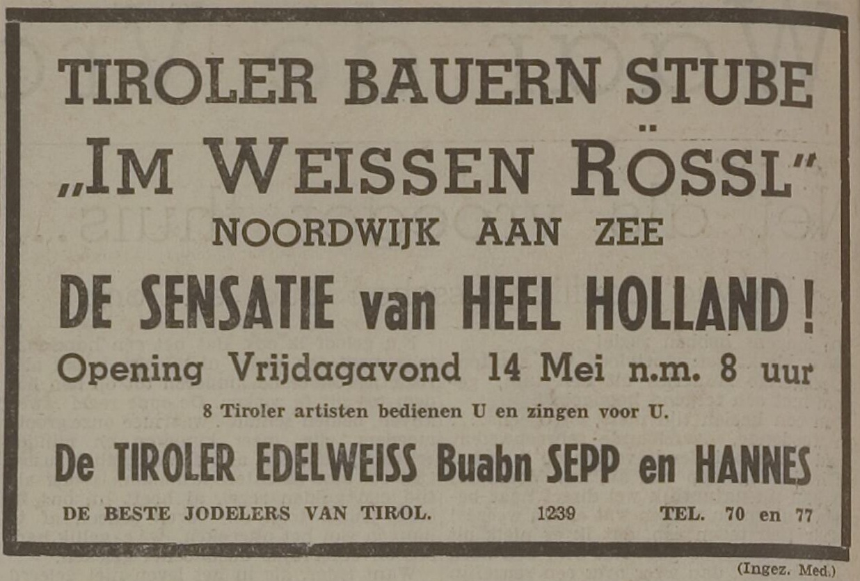 De Tiroler Bauern Stube “Im Weissen Röss’l” opende op 14 mei 1937 zijn deuren aan de Noordboulevard in Noordwijk. Daarmee werd zo ongeveer het hele Salzkammergut vanuit Oostenrijk naar zee verschoven, als we de wervende advertentie mogen geloven: niet minder dan 8 heuse Tiroler dames en heren zingen en bedienen er en ook de Tiroler Edelweiss Buabn (Oostenrijks voor ‘Buben’) Sepp en Hannes zouden hem die avond van katoen geven.