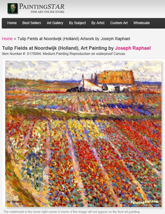Waar Noordwijkse Tulpenvelden zo ongeveer uit Noordwijk zelf verdwenen zijn, zijn ze in de Verenigde Staten nog gewoon te koop. Bij Paintingstar, “the fine art online store”. Het schilderij van Joe Raphael kwamen we al eerder tegen.