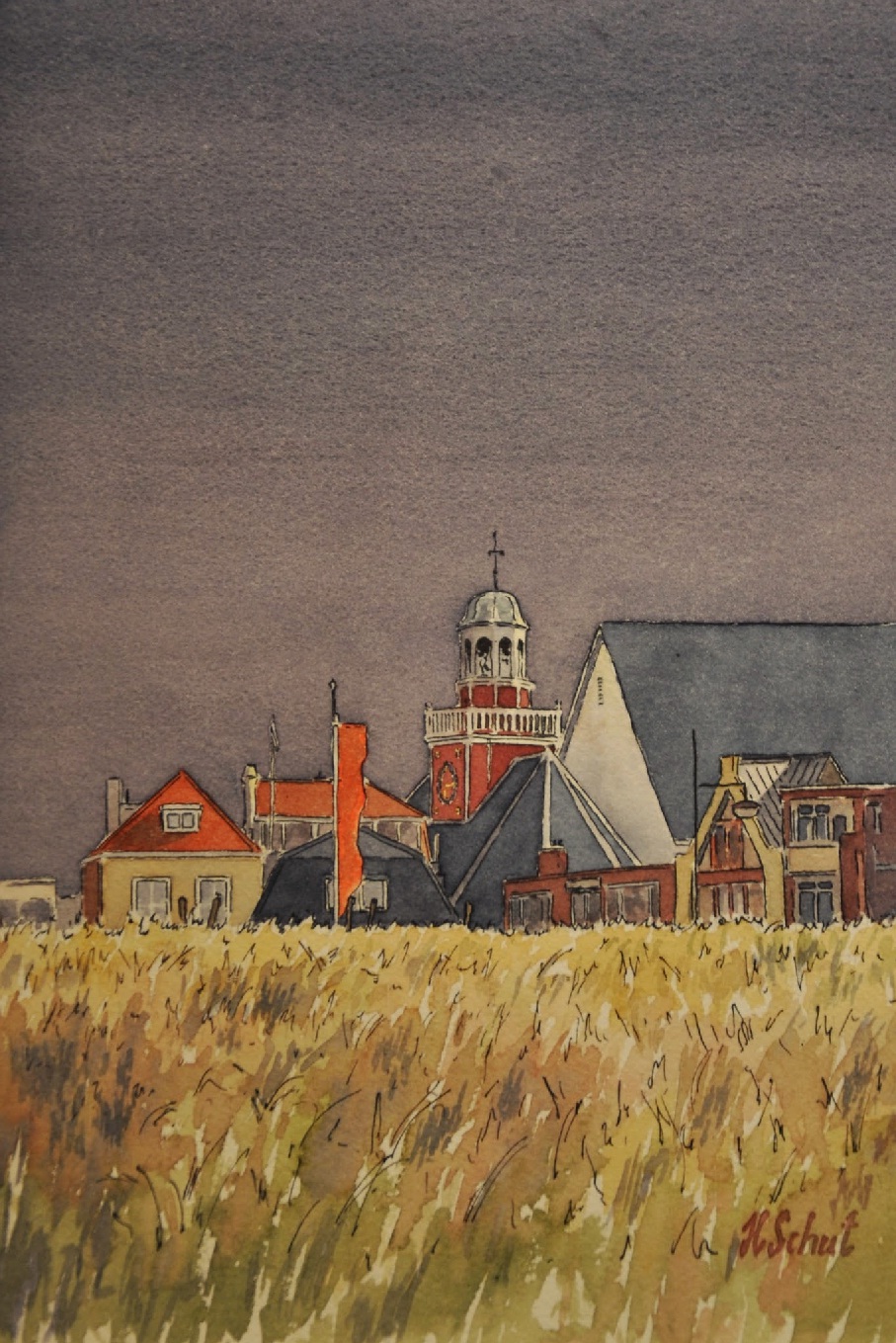 De kunstenaar Hein Schut is gespecialiseerd in het maken van – prachtige – aquarellen. Ook Noordwijkse beelden zijn in zijn waterverven vastgelegd, waaronder deze van de oude kapel aan de Hoofdstraat, bezien vanaf de zeereep.