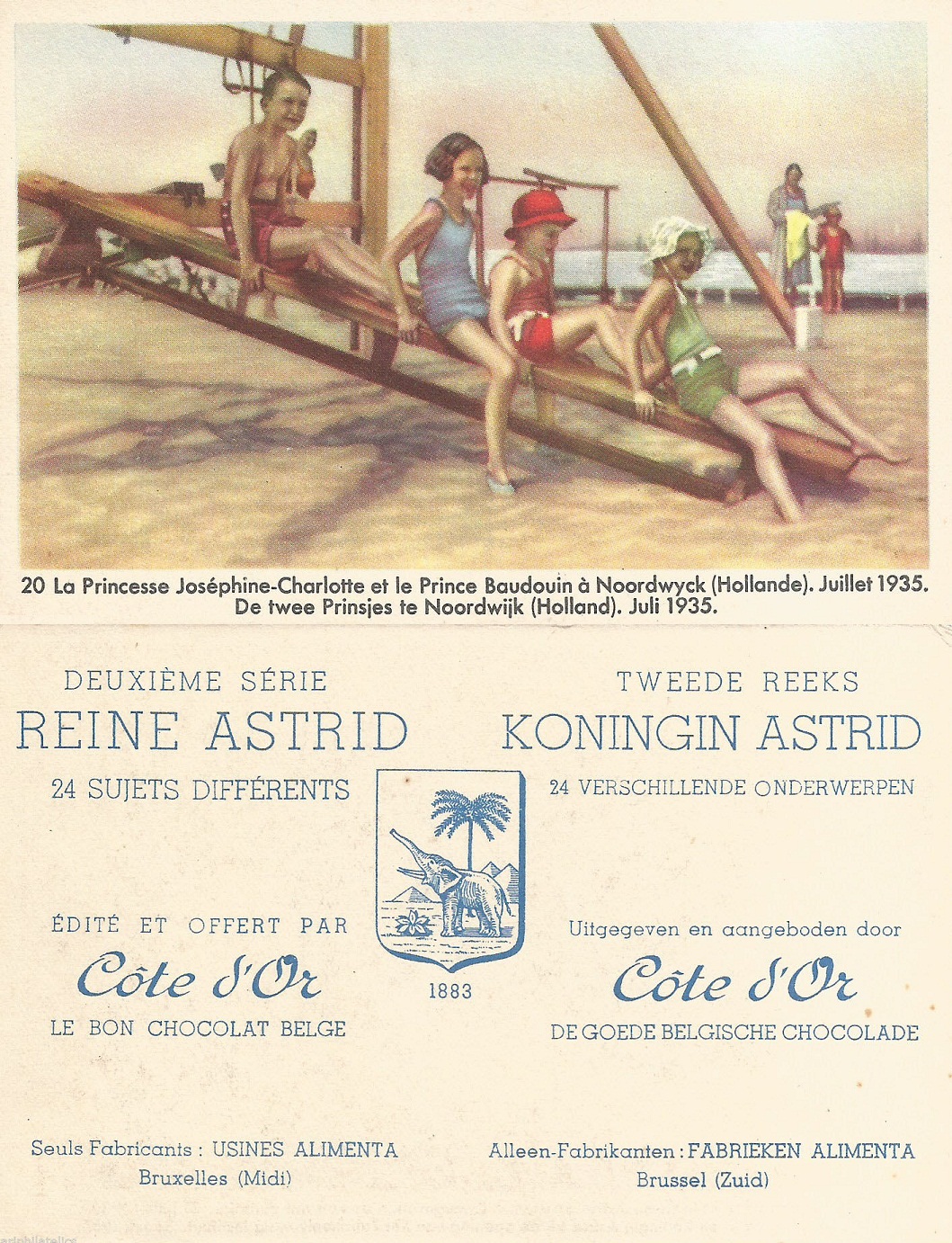 Het is al vaker gememoreerd en hier aan de orde geweest: de aanwezigheid van de toenmalige Kroonprins (en latere Koning) der Belgen, Boudewijn en zijn zusje (de latere Groothertogin van Luxemburg) Joséphine-Charlotte in de zomer van 1935 in Noordwijk. Ze speelden daar met het grut van Noordwijks burgemeester Van den Mortel en de paparazzi waren niet bij hen weg te slaan. Van één van de persfoto’s maakte Côte d’Or in België heel andere chocolade: een plaatje dat je kreeg bij aankoop van een reep of tablet.