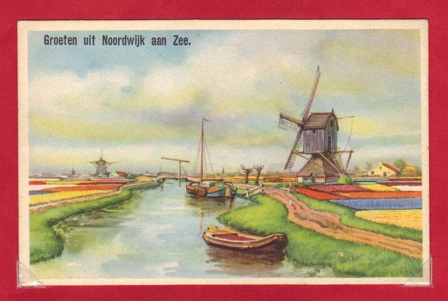 Het is een nijver stukje teken- en schilderwerk, maar wie veronderstelt dat de maker ervan met schildersezel en al ergens in Noordwijk aan Zee heeft zitten werken, komt bedrogen uit. Plaatjes als deze zijn in Noordwijk aan Zee nergens te vinden. In Noordwijk Binnen kun je je er met goed fatsoen nog wel een voorstelling van maken, maar dan zou je tenminste toch één van die molens moeten wegretoucheren en dat ophaalbruggetje zou je ook nergens kunnen vinden. Kortom, wie door dit plaatje werd aangelokt om naar Noordwijk te komen, zou zich geflest kunnen voelen, ware het niet dattie er natuurlijk wel een heleboel andere mooie dingen zou aantreffen. Nóg mooiere.