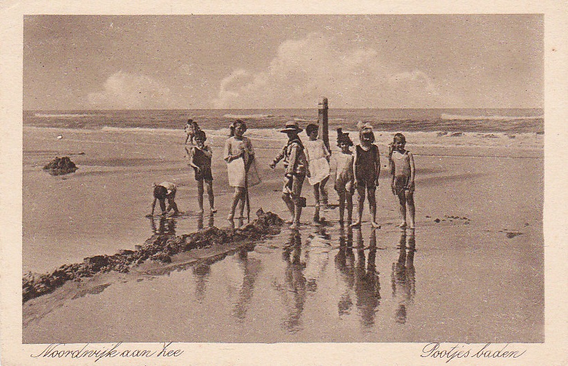aan deze voet van de duinen ligt het zachte zand van het strand,gewassen door het rijzen en vallen van het getijen bezaaid met schelpen .groten en kleine badplaatsen ,de een na de ander ,strekken zich uit zover het oog reikten zelfs nog verder,rijen tenten van riet hout en linnen die een kamp vormen voor hele families,kinderen die in het zand spelen,de gehele bevolking badend en koesterend in het milde zonlicht en daarna een koele duik in het zilte nat de zee alles draait om de zee,…