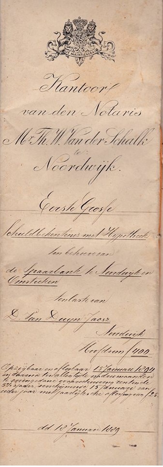 Op internet duikt een hypotheekacte op van 18 januari 1889. Het hypotheekbedrag was 400 gulden en dat klinkt helemaal naar niks, maar moet indertijd toch een flinke som gelds zijn geweest. Het was notaris Theodor Willem van der Schalk die de acte verleed. Van der Schalk, Schiedammer van geboorte, was advocaat en notaris in Noordwijk. Hij behoorde tot de absolute notabelen van het dop en bezat ook het allermooiste huis (“De Lindenhof” aan het Lindenplein). Hij kwam om het leven bij een ongeluk met paard-en-wagen in leiden.