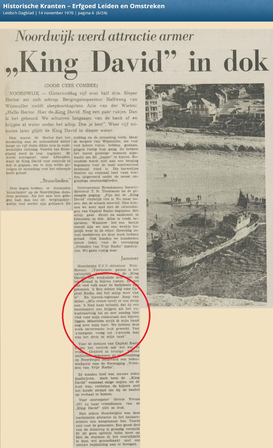 Naar aanleiding van een stukje over de stranding van de King David – het zendschip van Capitol Radio – in november 1970 op het strand van Noordwijk, schreef Perry de volgende reactie: