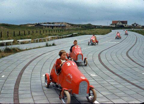 Harry komt met deze foto op “je bent een Noortukker”. Een pracht van een exemplaar. Eén van de weinige, zo niet de enige foto in kleur die ik van de Flying Arrow Trapautootjesbaan aan het Wantveld ooit ben tegengekomen. Mezelf vaak het schompes getrapt in deze autootjes, net zolang totdat ik net zo vuurrood zag als deze blinkende carrosserie.