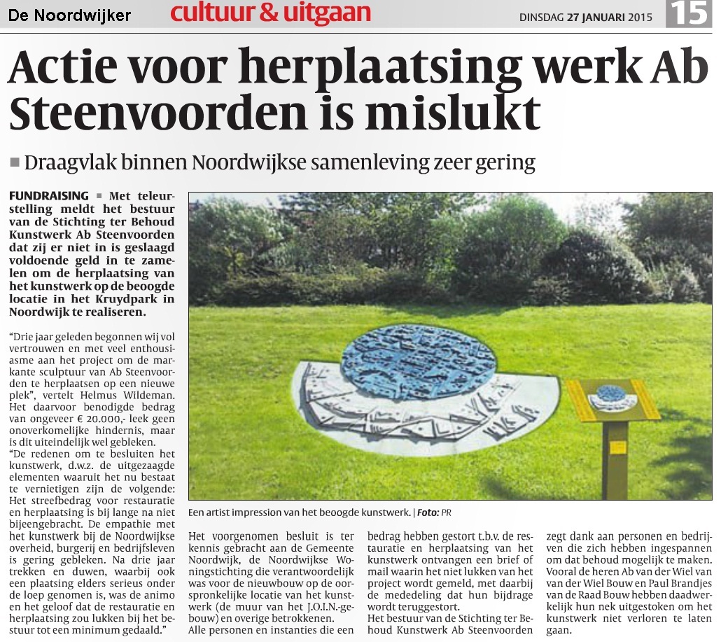 Het kunstwerk van wijlen Ab Steenvoorden dat jarenlang de achtergevel sierde van de voormalige RK Jongensschool aan de Zeestraat kon bij de sloop van die school voor de poorten van de hel worden weggesleept. Maar tig jaren later lijkt het kunstwerk geen perspectief meer beschoren. Een welgemeend en terecht initiatief om het werk een andere plek in Noordwijk te geven, stuitte blijkbaar op gebrek aan draagvlak en gebrek aan geld (meestal is dat hetzelfde). Het ging om een benodigd bedrag van € 20.000, ‘dat bij lange na niet werd gehaald’, aldus de initiatiefnemers. Wat er nu met het kunstwerk gaat gebeuren is onduidelijk, vernietiging lijkt de enige en meest vreselijke optie.