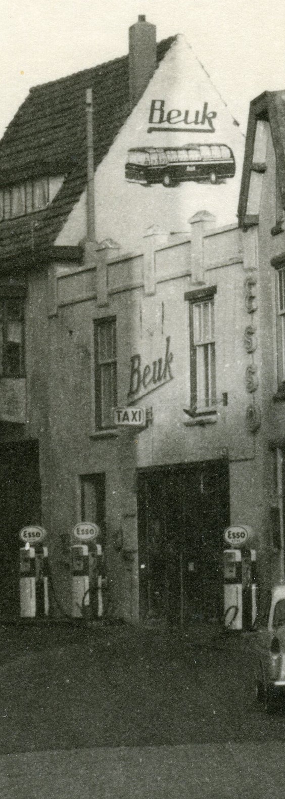 Misschien wist de firma Beuk al dat ze hier weg zou trekken uit de Jan Kroonsweg. Misschien was de firma al vertrokken naar het nieuwe pand aan de Lageweg. Maar de panden die ze zou achterlaten stonden er nog een hele tijd te staan en te verworden tot ouwe meuk. Wat bleef was een soort van fresco, hoog aan de muur van een touringcar en de sierlijke letters ‘Beuk’. Ik heb me altijd afgevraagd hoe dat fresco daar ooit terecht gekomen is. Flinke steiger op het platte dak en een winterschilder (wie?) met blauwe verf die voor een schappelijke prijs en met gevaar voor eigen leven de bus schilderde op het witte vlak? Zoiets? De pompen van Esso en de dito neonletters op de gevel waren ook mooi, maar het fresco had wel gered mogen worden.