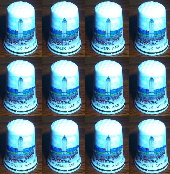 Een tijdje geleden constateerden we dat er souvenir-achtige vingerhoedjes in omloop waren met een afbeelding van Noordwijk erop. Wat je allemaal niet kunt verzinnen om de souvenir-business te voeden. Ik denk dat vingerhoedjes nauwelijks meer worden gebruikt (er wordt – denk ik – ook niet zoveel meer met naald en garen omgesprongen). Maar nu vind ik wéér een souvenir-vingerhoed, een andere, maar nog steeds met een beeld van Noordwijk erop.