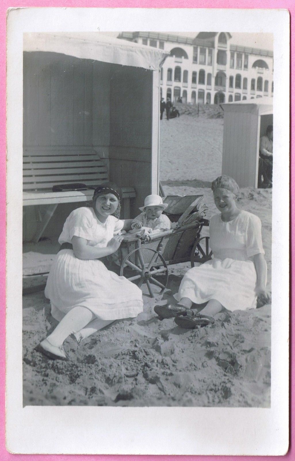Even typische als prachtige strandfoto van twee vrouwen en een kind in een heuse bolderkar. Schuins voor Hotel Noordzee op de achtergrond. Geen verdere persoons- of datumvermelding, helaas. In de tijd blijven ze noodgedwongen anoniem. De fotograaf ook.