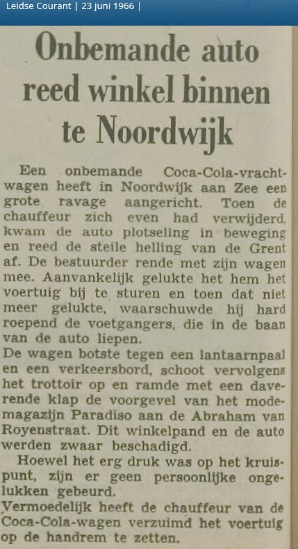 Ron komt met deze bijzondere foto van een CoCa Cola-vrachtauto (die ook Fanta frisdranken vervoerde). Het ding heeft zich op 22 juni 1966 bruisend in de voorgevel gedrongen van Modemagazijn Paradiso, onder aan De Grent, en je vraagt je af hoe dat nu weer in hemelsnaam mogelijk is geweest.