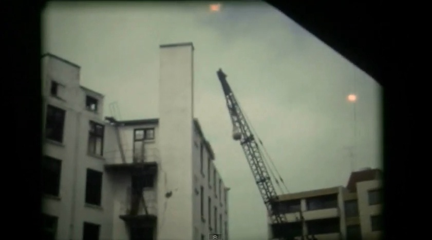 Een still uit de eerder gememoreerde film van Rob over de brand en de sloop van het voormalige Palace Hotel. De brute kracht van de sloopkogel staat op het punt het oude ‘paleis’ opnieuw te verwonden. Dramatisch beeld van een dramatisch moment in de geschiedenis van Noordwijk. Een beeld waar je je ogen niet droog bij houdt.