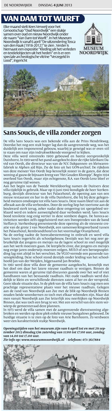 Ik heb in ‘Sans Soucis” gewoond van 1946 tot 1953. Parterre was een dependance gevestigd van de R.K. lagere school te Noordwijk Binnen (2 klassen, hoofd: meester van der Weide en verder meester Floor als ik mij goed herinner) Boven woonden wij(gezin met 4 kinderen, de jongste geboren in dit huis) en de fam Buize, uitgever Noordwijkse Courant. In de naastgelegen voormalige dienstwoning woonden de heer en ”juffrouw'” Bulk. Ik herinner mij dat eens de eigenaar op bezoek kwam, de heer Oordt (of van Oordt) Het huis was toen, rond 1950, kennelijk nog in het bezit van deze familie. Rond die tijd verbleven op de ruime zolder, die wij deelden met de fam.Buize, repatrianten uit (toen al voormalig) Nederlands Indie. Na enkele weken verhuisden zij naar pension WaiKiki, in afwachting van definitieve woonruimte. Heerlijk huis, uitzicht over de bollenvelden, mooie tijd.