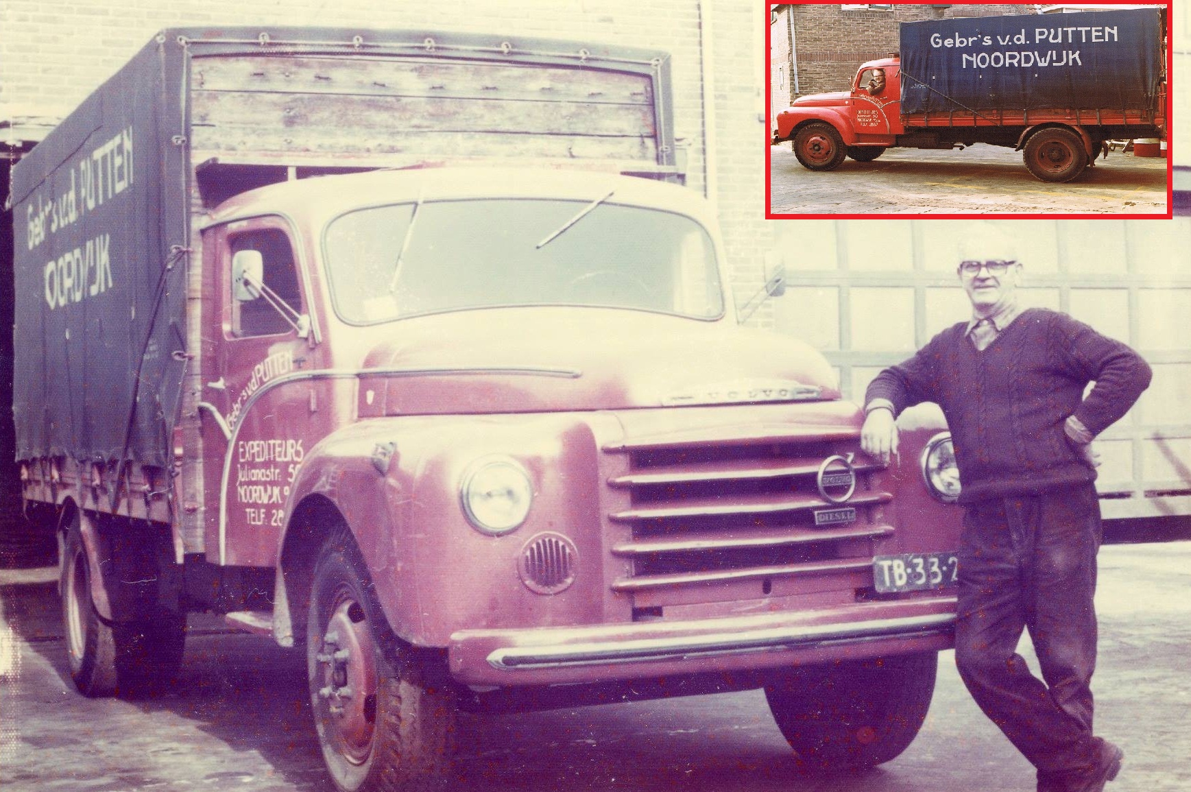De foto’s lijken me ongeveer gelijktijdig genomen, zij het dat de ene wat meer contrast meegekregen heeft dan de andere. Een prachtige oude Volvo van de Gebroeders V.d. Putten, ‘expediteurs’ in Noordwijk aan Zee. Later beroemd geworden ook tot ver in Noordwijk Binnen vanwege de zgn. ‘puttenbak’. Het bedrijf zat (zit?) aan de Julianastraat in Noordwijk aan Zee en ik denk dat de foto daar ook genomen is. Vraag natuurlijk: wie is de man op de foto? Op “je bent een Noortukker’ waar deze foto opduikt, wordt daarover geen uitsluitsel geboden.
