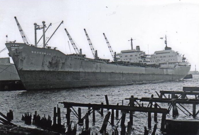 De geschiedenis van dit vrachtschip heb ik wel eens eerder beschreven. De foto treft me, omdat ze hier ligt aangemeerd in een wat troosteloze en aggenebbische omgeving, waarin een schip dat trots de naam “Noordwijk” voert helemaal niet zou moeten wezen. Het schip zelf ziet er ook niet al te best uit. Daar hadden wel een paar zeelieden overboord mogen hangen met een paar potten menie en een dikke verfkwast.