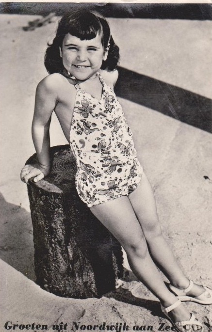 De kaart werd in 1958 vanuit Noordwijk verstuurd, maar dat wil nog niet eggen dat de foto ook daadwerkelijk in Noordwijk genomen was. Kan wel, maar dat dikke stuk boomstam lijkt me een beetje on-Noordwijks: meer een onderdeel van die palenrijen in zee, die je vaak in Zeeland nog wel tegenkomt. Maar niet in Noordwijk. Niettemin een leuke foto van een kind dat geniet op het strand. Daarvan waren er in Noordwijk heel veel. Hoe dan ook.
