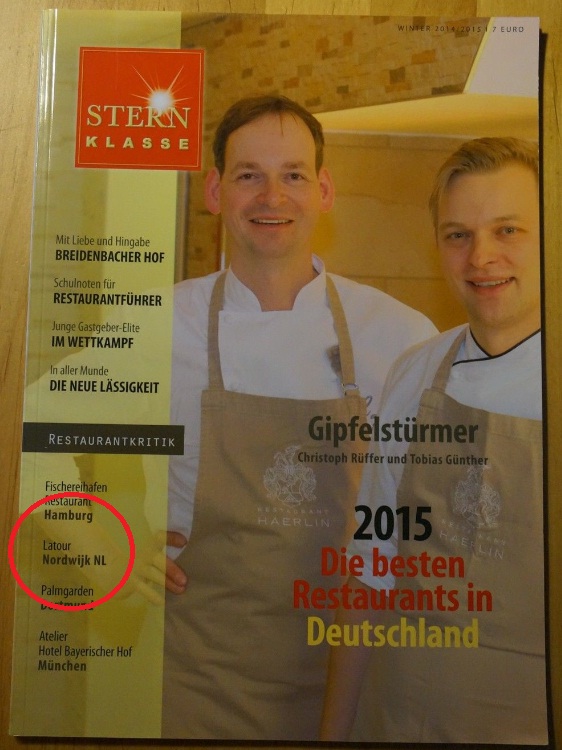 Het Duitse tijdschrift “Stern” geeft blijkbaar ook een restaurantgids uit en in de aflevering “Stern Klasse Winter 2014/2015” wordt ook restaurant Latour in Noordwijk (‘Nordwijk’ op zijn Duits) besproken. Hoe Latour het er vanaf heeft gebracht in de ‘Restaurantkritik’, weet ik niet. Maar afgaande op de m.i. nogal zware smaak van de Deutsche Küche vermoed ik: niet slecht!