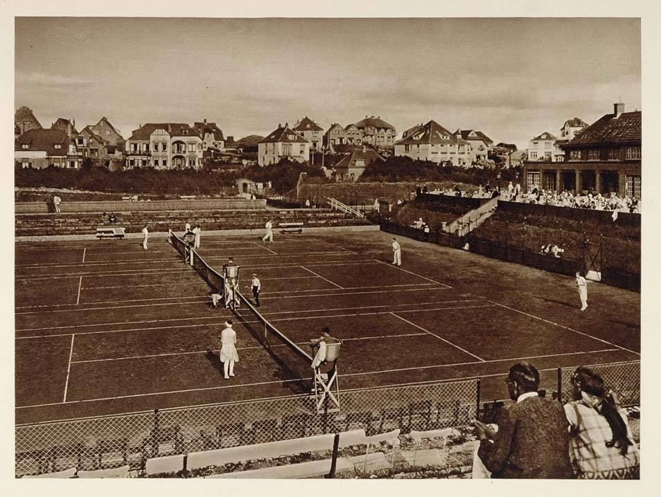 Twee prachtige foto’s van tenniswedstrijden op de Casinobanen in Noordwijk aan Zee. Aan de tenniskleding te zien moeten de foto’s ongeveer in dezelfde tijdspanne zijn gemaakt. De onderste foto toont de hoofdbaan met extra, zij het niet volbezette tribunes, de bovenste de bijbanen.