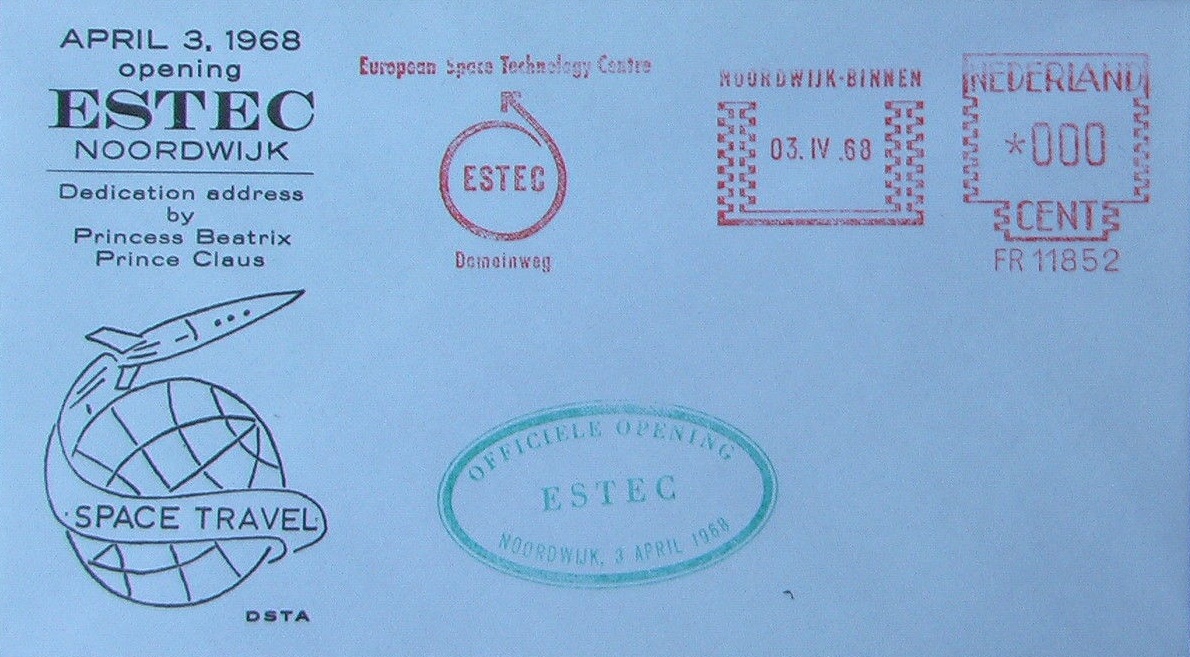 Het European Space Technology and Research Centre (ESTEC) op de bovenste foto nog in aanbouw in 1966. Het Centrum was aanvankelijk gevestigd in Delft, maar om mij onduidelijke redenen werd op enig moment besloten de hele bliksemse boel naar Noordwijk te verplaatsen. De opening vond plaats door Prinses Beatrix en prins Claus op 3 april 1968 – nu al weer 47 jaar geleden – en bij die gelegenheid werd er een speciale herdenkingsenveloppe uitgegeven die met 0,00 gulden was gefrankeerd.