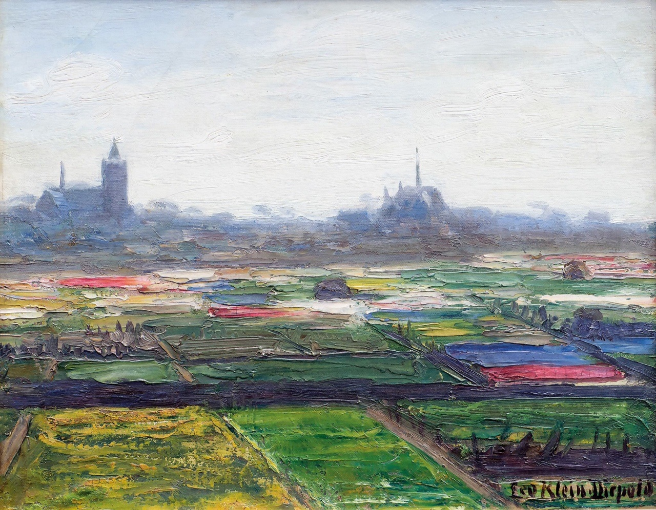Een schilderij met zich op Noordwijk Binnen. Met daartussen de tulpen- en hyacinthen- en narcissenvelden, lekker vet in de verf aangezet. Ik heb een soortgelijk schilderij van Klein Diepold (zie hieronder), ook met bloemenvelden, maar minder vet aangezet dan deze.