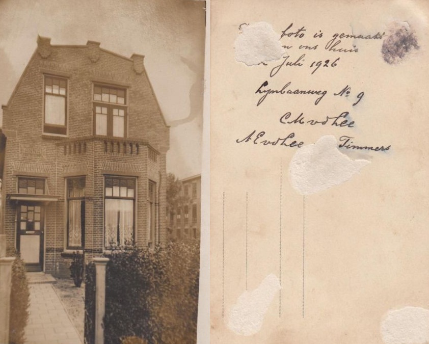 Ik weet ook dat Van der Lee overleed – volgens de overlijdensacte – in en wel in het pand Nieuwe Zeeweg 57. Maar intussen woonde hij – blijkens bijgaande fotokaart uit juli 1926 – aan de Lijnbaanweg nummer 9. Samen met zijn op marktplaats.nl duikt deze fotokaart op met op de ommezijde exact beschreven waar het allemaal om ging: het was in ieder geval in juli 1926 het woonhuis van hem en zijn echtgenote Anna Elisabeth Timmers. Het echtpaar kreeg 5 kinderen.