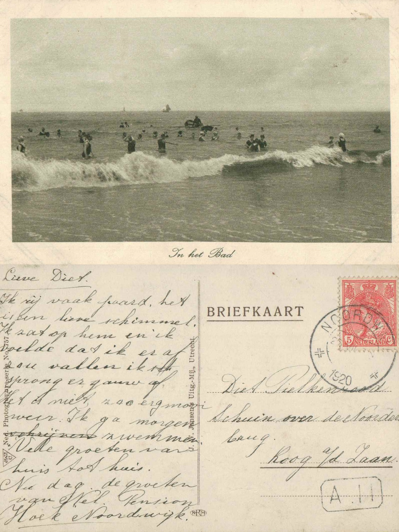 Ik rij vaak paard, het is een lieve schimmel. Ik zat op hem en ik voelde dat ik er af zou vallen, ik sprong er gauw af. Het is niet zoo erg mooi weer. Ik ga morgen zwemmen. Vele groeten van huis tot huis. Nu dag, de groeten van Nel, Pension Hoek Noordwijk (juli 1920).