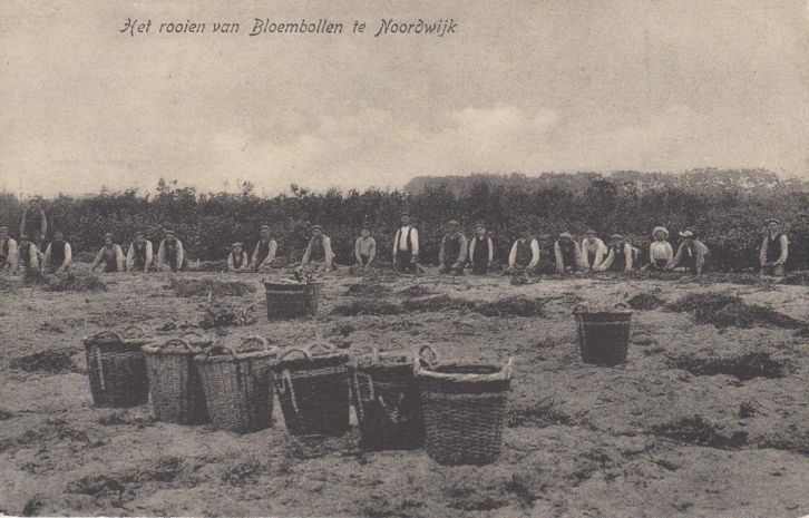 “Het rooien van bloembollen” is de pakkende titel van de foto. Zo’n 20 man (en één vrouw??) die zich met deze bezigheid onledig hielden. Een rot klus: de hele dag op je knieën met een soort van troffel, waarmee je een regel bollen instak, ze van onderen losmaakte en ze met je blote handen raapte en in een klein mandje (‘kabussie’) wierp. Op de grotere manden (‘mandes’) lees ik ‘PvdM’, wat wel gestaan zal hebben voor ‘Piet van der Meer’. Tegenwoordig ga je met hooguit twee man en één machine over een heel bed bloembollen heen. Geen troffels, rauwe handen en stijve ruggen meer.