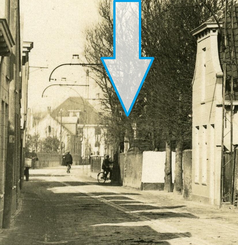 Deze foto is eigenlijk het verlengde van de vorige. Daarop – we zitten nog steeds in 1925 – de plek waar vroeger een boerderij stond en later het huis van mijn grootvader. Dat werd in 1928 gebouwd en enkele jaren geleden weer afgebroken om plaats te maken voor een appartementencomplex. De pijl geeft de lokatie aan van de plek waar het huis heeft gestaan.