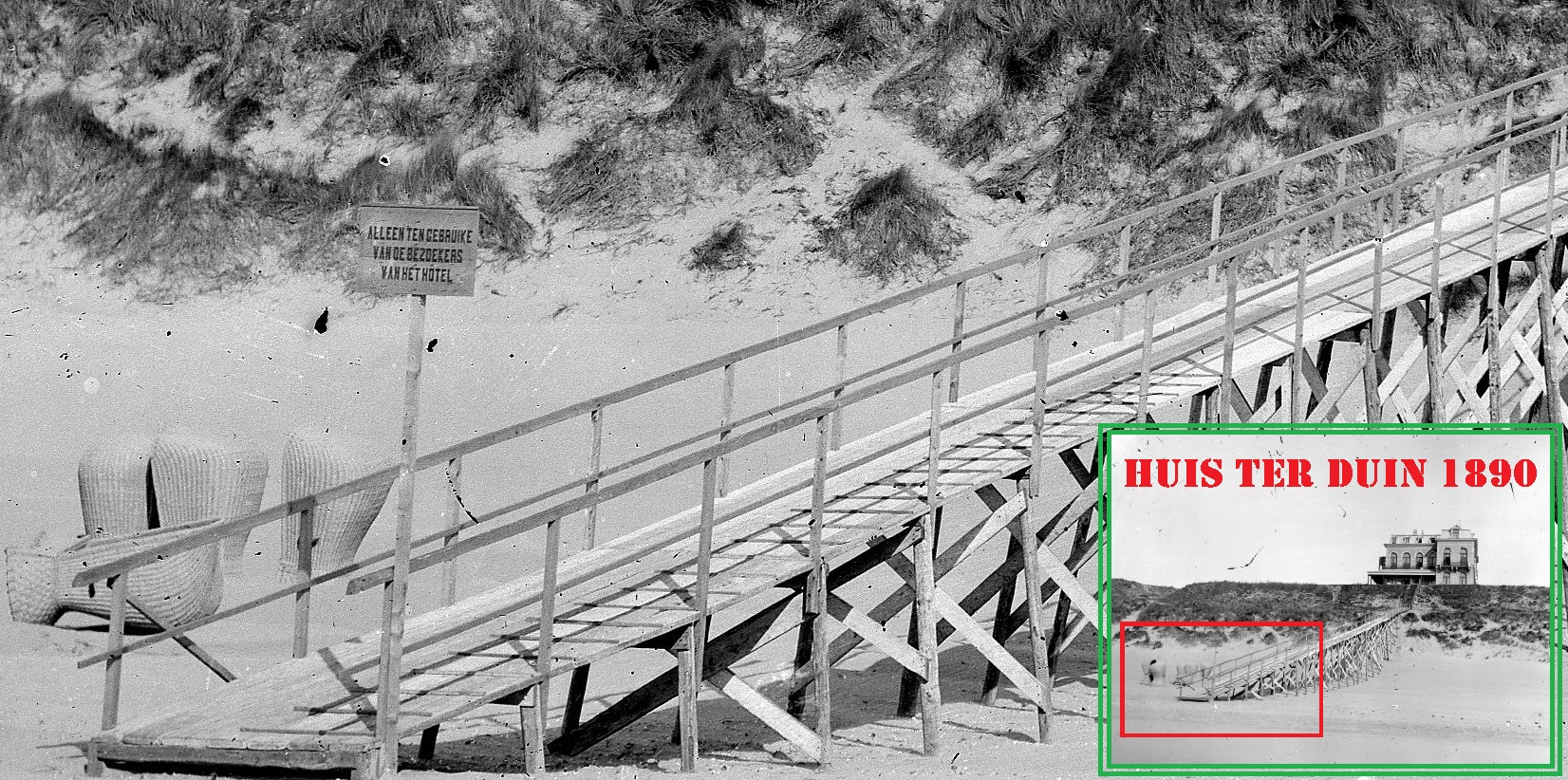 Een giga loopplank, waariop half timmerend Noordwijk zijn best had gedaan, verbond het oude Huis ter Duin met het strand. De grote foto toont slechts een detail van het monstrueuze geheel met aan de voet een waarschuwend bord (klik dubbel op de foto): “Alleen ten gebruike van de bezoekers van het hotel.”