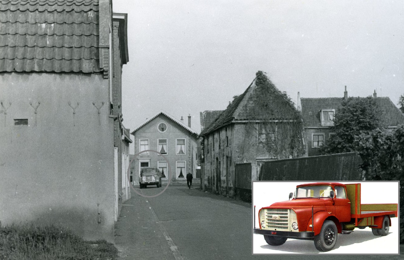 Een inkijkje in het laatste stukje Schiestraat richting Heilige Geestweg. Het oude pand rechts van rijwielhersteller, annex esperantist, annex fotograaf Braakman staat er nog, begin jaren zestig. Op de weg een prachtige oude DAF Torpedo vrachtwagen. ‘Torpedo’? De Wikipedia schrijft het volgende over deze on-DAFse truck: