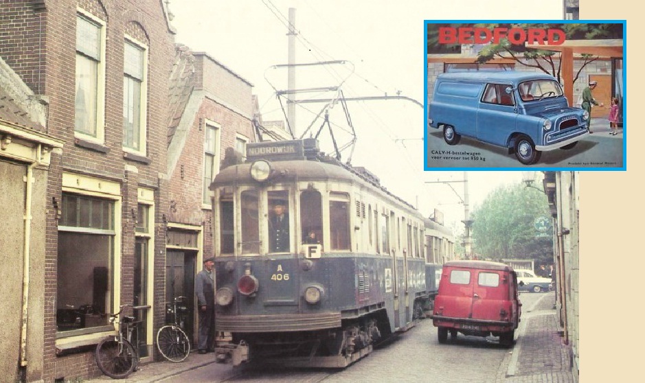 Aan de andere kant van de straat staat de Bedford CAV bestelwagen van dezelfde Gebroeders. Ze hadden deze prachtauto (stoere schuifdeuren vóór) overgenomen van de lokale PTT en reden er nog jaren mee door de straten van Noordwijk.