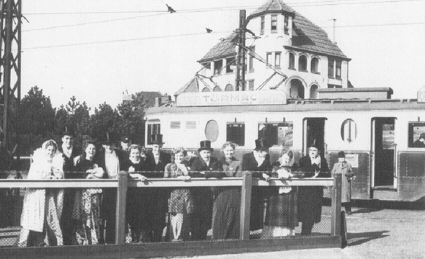 Vrolijk volk, mooi uitgedost, Jove mag weten bij welke gelegenheid dit was. Ik verbeeld me dat het Noordwijkers zijn, die straks aan boord van de tram gaan om Leiden op stelten te zetten. Maar het is waarschijnlijk andersom: het zijn net gearriveerde Corpsballen van Minerva uit Leiden, vergezeld door meisjes van de Vereeniging van Vrouwelijke Studenten te Leiden (VVSL), die in Noordwijk een feestje te vieren hebben.
