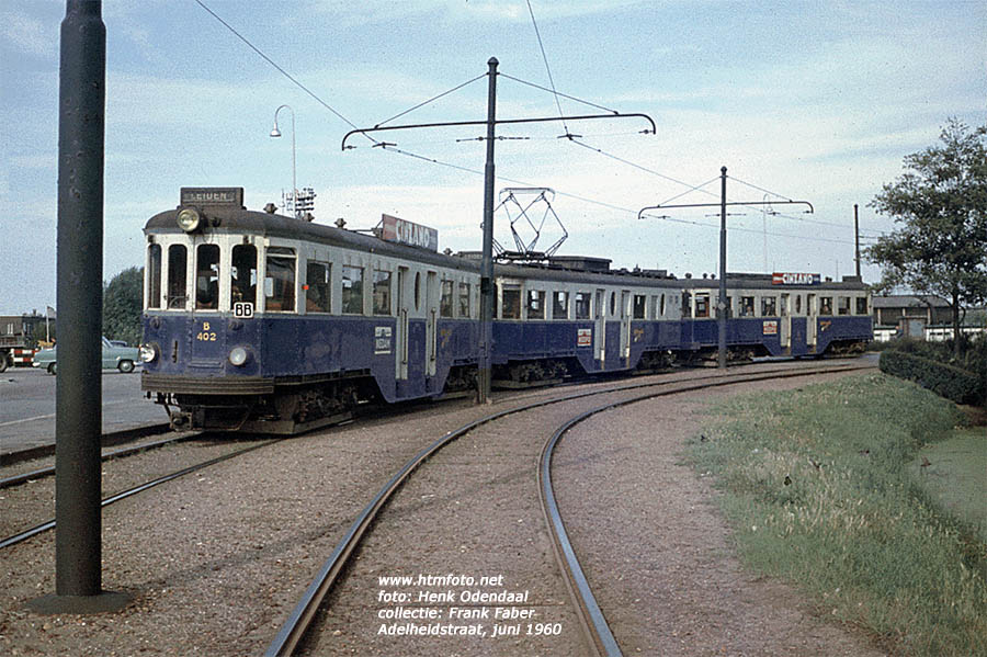 Deze tram is een zogenoemde hele schakel Boedapesters. Het stel is als dienst BB, nee geen Brigitte Bardot, een spitsdienst, op weg van Leiden naar Den Haag Malieveld en zal pas dan terugkeren naar Leiden. Eea. is te zien aan de boog rond de schooltuintjes (rechts op de foto) van de Adelheidstraat (verlengde van de KW-laan uit Voorburg) naar de Schenkkade en verder naar de halte “Nova Zembla” in het verlengde van de Charlotte de Bourbonstraat.