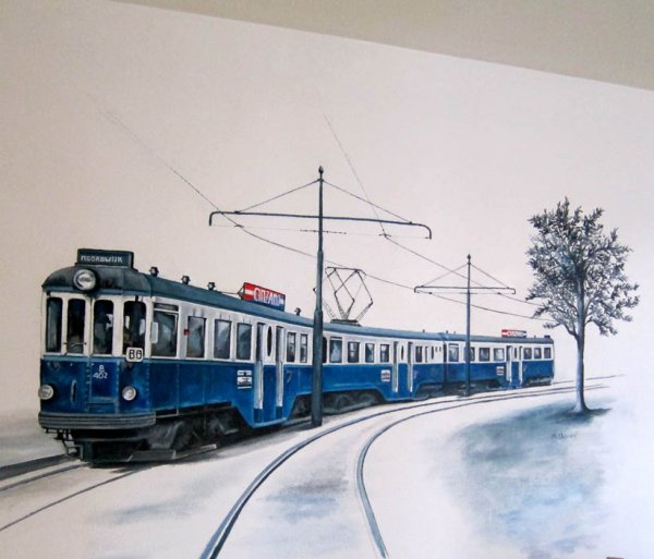 Even dit: oorspronkelijk was het beeld allemaal niet zo ‘besneeuwd’ als het op de schildering lijkt: de tram werd in deze vorm en in deze bocht betrapt op de Adelheidstraat in Den Haag en niet in de winter, maar in de maand juni van 1960 (en hij was ook niet op weg naar Noordwijk, maar naar Leiden) 🙂