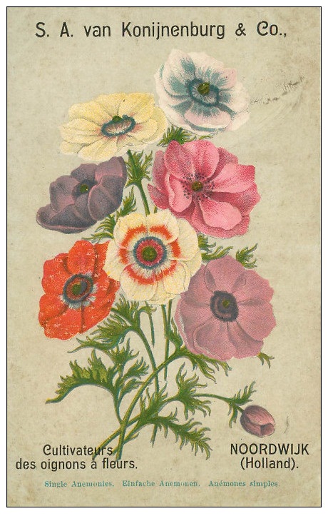 S.A. van Konijnenburg (“Siem Knijn”) was in zijn tijd een hele grote. Groot en vermaard bedrijf dat ook zijn vestigingen had in Engeland en Frankrijk. Deze kaart was bedoeld voor de Franse markt. Hij laat anemonen zien, maar Van Konijnenburg had meer te bieden dan dat: ‘Cultivateur des oignons à fleurs’: ik vertaal het maar als ‘bloembollenkweker’, ofschoon ik op school wel leerde dat een ‘oignon’ een ‘ui’ was, maar geen ‘bol’. Enfin. De kaart is er niet minder om. Op de achterzijde stonden ook nog enkele mededelingen voor de geinteresseerde Francofoon: