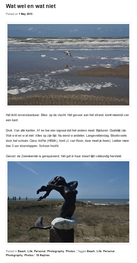 Collega-blogger Blewbird is een strandwandelaar pur-sang. Hij observeert, mediteert en maakt prachtige foto’s. Hij komt ook wel eens langs Noordwijk, zoals op 1 mei jongstleden op weg naar de Langevelderslag. Observaties onder meer over de koffie bij de HEMA, over de tosti’s bij J. van Roon en over de gerepareerde staart van de bronzen zeemeermin. Voor meer: klik hier